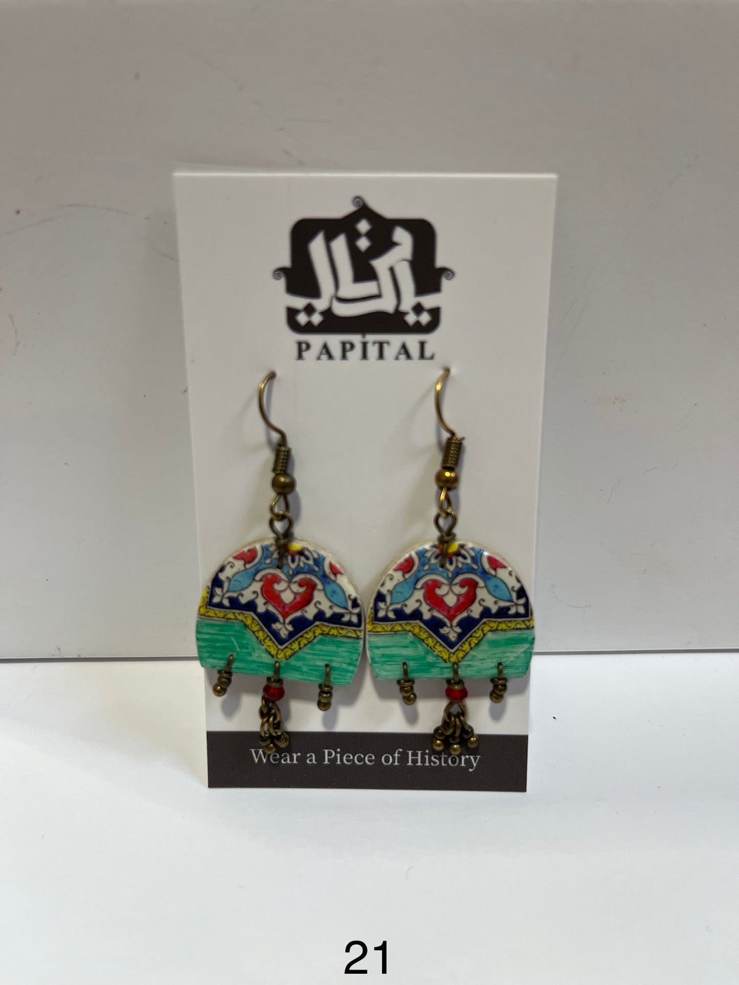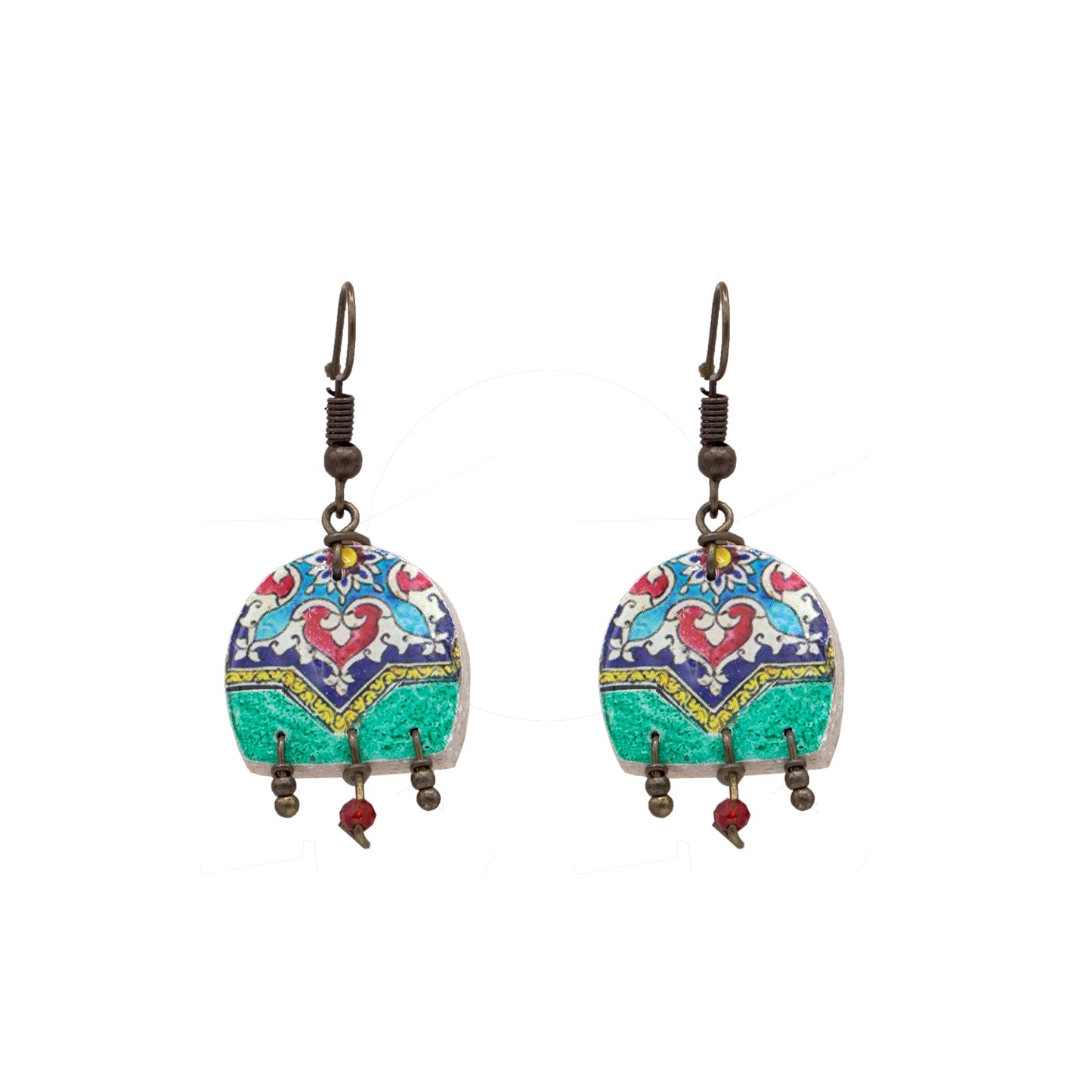 These boucles d'oreilles en carrelage s'inspirent de l'art ancien de la fabrication de carreaux persans. The colorful arabesque motifs on the piece are furnished with fascinating decorative mosaics that are found in the mosques and historical palaces remontant in the 19th century. En utilisant le matériau le plus courant - l'argile - this young équipe d'artistes conçoit et fabrique des carreaux chatoyants qui se transforment en accessories modernes et à la mode.